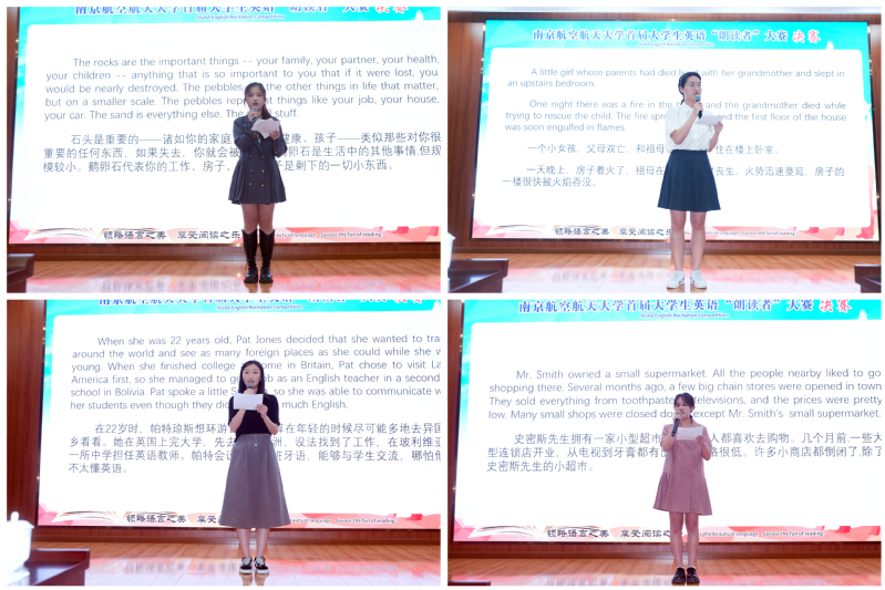 为进一步提高腐漫画 大学生英语口语表达能力和朗读技巧,增强学生用英语讲好中国故事的能力,拓宽学生国际视野,为腐漫画 培养具有中国情怀、国际视野和跨文化沟通能力的人才,6月14日腐漫画 首届大学生英语“朗读者”大赛决赛在南航将军路校区图书馆一楼报告厅顺利举办。本次大赛由腐漫画 教务处主办,学生处以及校团委协办,腐漫画 和图书馆联合承办。将军路校区党工委书记邬沛雄、国际教育学院院长金泉元、腐漫画 院长范祥涛、教务处副处长李晋斌、教师发展与教学评估中心副主任卢丽丽、艺术学院副院长朱琰、长空学院副院长彭聪、学生处处长助理魏东博、校团委副书记惠成钢、丹麦籍外教Thomas Schumann、美国籍外教Geoffray Bogan、美国籍外教Jackie Coon等出席决赛并担任评委。此外,大赛邀请到了图书馆党总支书记周克印、腐漫画 党委书记左彤云、图书馆副馆长沈伯秀、党委宣传部副部长李秀龙、腐漫画 副院长徐以中及腐漫画 党委副书记吴科颖担任嘉宾。