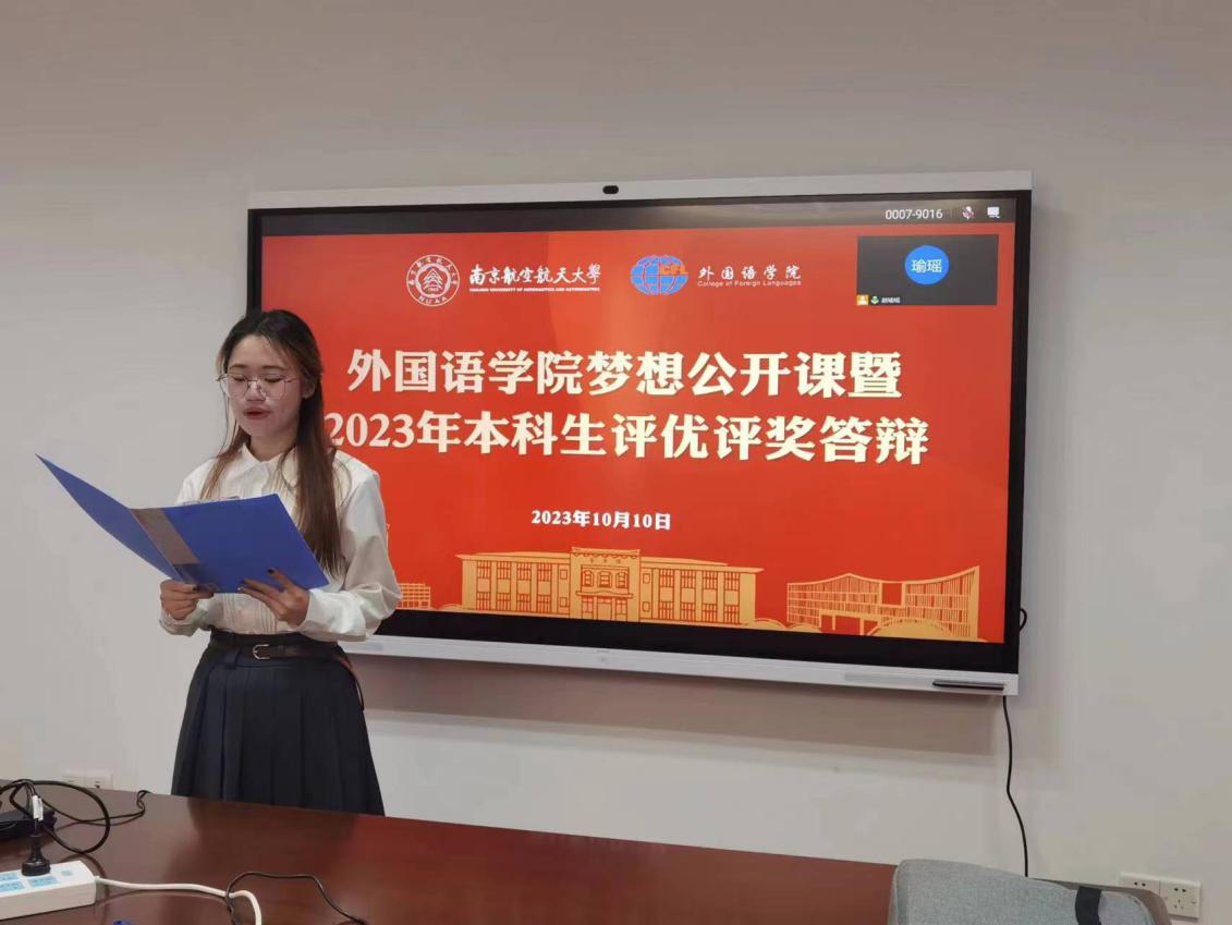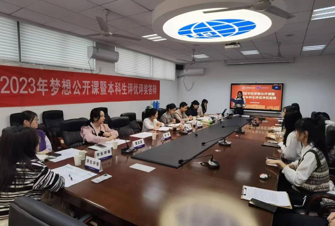 为全面贯彻落实党和国家的教育方针,积极推进我校培养具有“责任意识、创新精神、国际视野、人文情怀”的社会栋梁和工程英才的人才培养目标,外国语学院于10月10日下午在学院322会议室举办梦想公开课暨2022-2023学年本科生评优评奖答辩。出席本次评审答辩会的评委老师有:外国语学院党委副书记吴科颖,院团委书记李萍,英语系副主任王伟,英语系教师代表曹璐,本科生辅导员彭欢、赵瑜瑶、曹文清,以及两名学生代表朱芸、王新怡。此次公开课由2022级英语专业学生廖海雲主持,学院同学通过腾讯会议在线观摩学习。