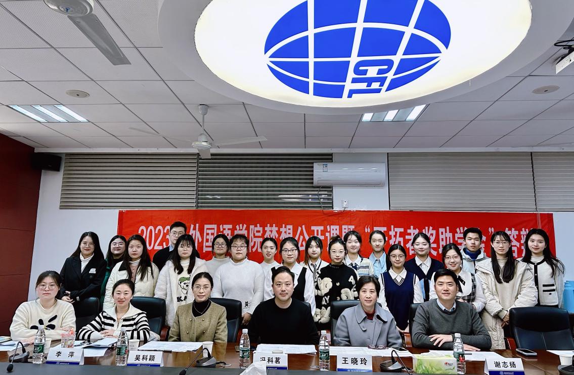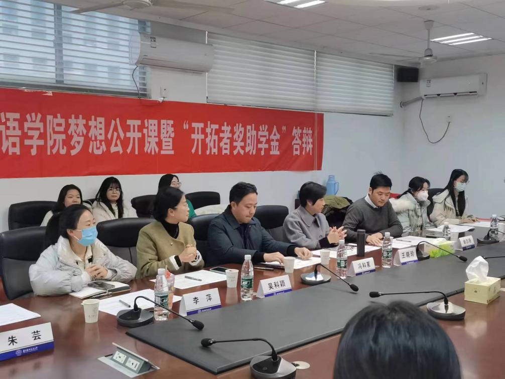 为激励外国语学院学生注重团队合作、积极进取、勇于担当、全面发展、成长成才,并资助家庭经济困难学生,自2020年起学院2010届优秀院友冯科茗、谢志扬、单鹤设立“开拓者奖助学金”。12月15日外国语学院举办梦想公开课暨“开拓者奖助学金”答辩。开拓者奖助学金资助人谢志扬、冯科茗,英语系教师代表王晓玲老师,外国语学院党委副书记吴科颖,英语系主任张立新,学院团委书记李萍,本科生辅导员彭欢、赵瑜瑶、朱芸担任评委。本次公开课由学院2020级英语专业、2022年开拓者奖学金一等奖获得者朱睿主持。