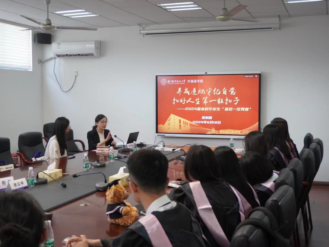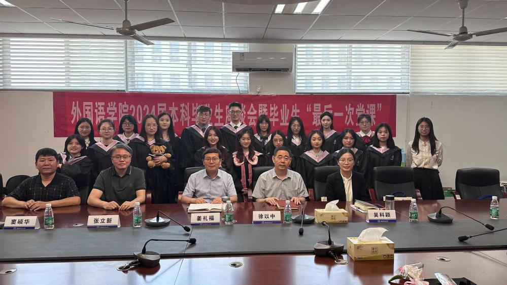 为进一步推动党纪学习教育走深走实,加强毕业生党员教育,6月18日,外国语学院隆重举办2024届本科毕业生座谈会暨毕业生“最后一次党课”活动。外国语学院党委书记左彤云、副院长徐以中、姜礼福、院党委副书记吴科颖、英语系主任张立新、日语系主任窦硕华、本科毕业班辅导员姚灵珑以及2024届毕业班全体党员参加本次活动。