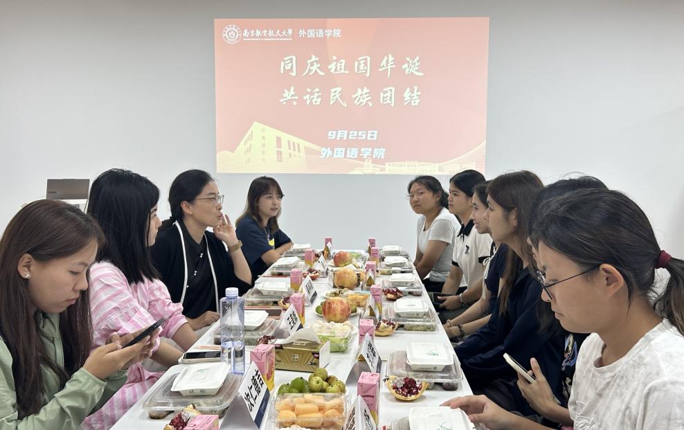 习近平总书记在中央民族工作会议上强调,要以铸牢中华民族共同体意识为主线,推动新时代党的民族工作高质量发展。为庆祝中华人民共和国成立75周年,关心关爱来自14个省份的34名少数民族同学,9月25日和26日,外国语学院在将军路校区、天目湖校区共同举办了“同庆祖国华诞,共话民族团结”多民族学生午餐会。外国语学院党委书记左彤云、党委副书记吴科颖,英语系班主任姜上、王美姝,本研各年级辅导员及各民族学生代表共同参加了本次午餐会。