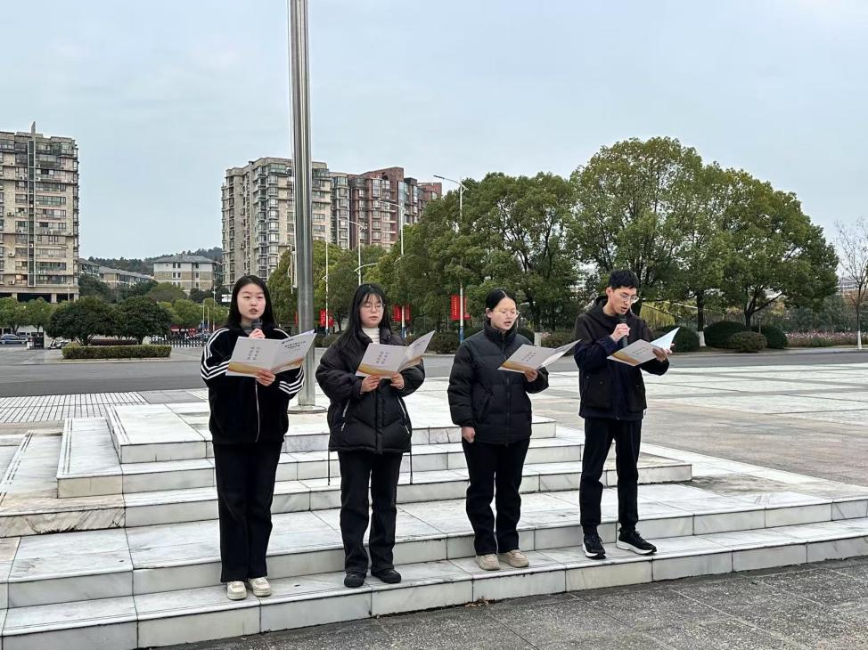 外国语学院本科生联合党支部党员代表吴明宇、黄天乐、刘珺培、王嘉玚带来主题为“铭记一二·九,青春谱新篇”的诗朗诵。他们以慷慨激昂的诗句带领同学们共同感受“一二·九”运动中中国共产党领导的青年学生的英勇与担当,激励当代青年奋发向上、砥砺前行。