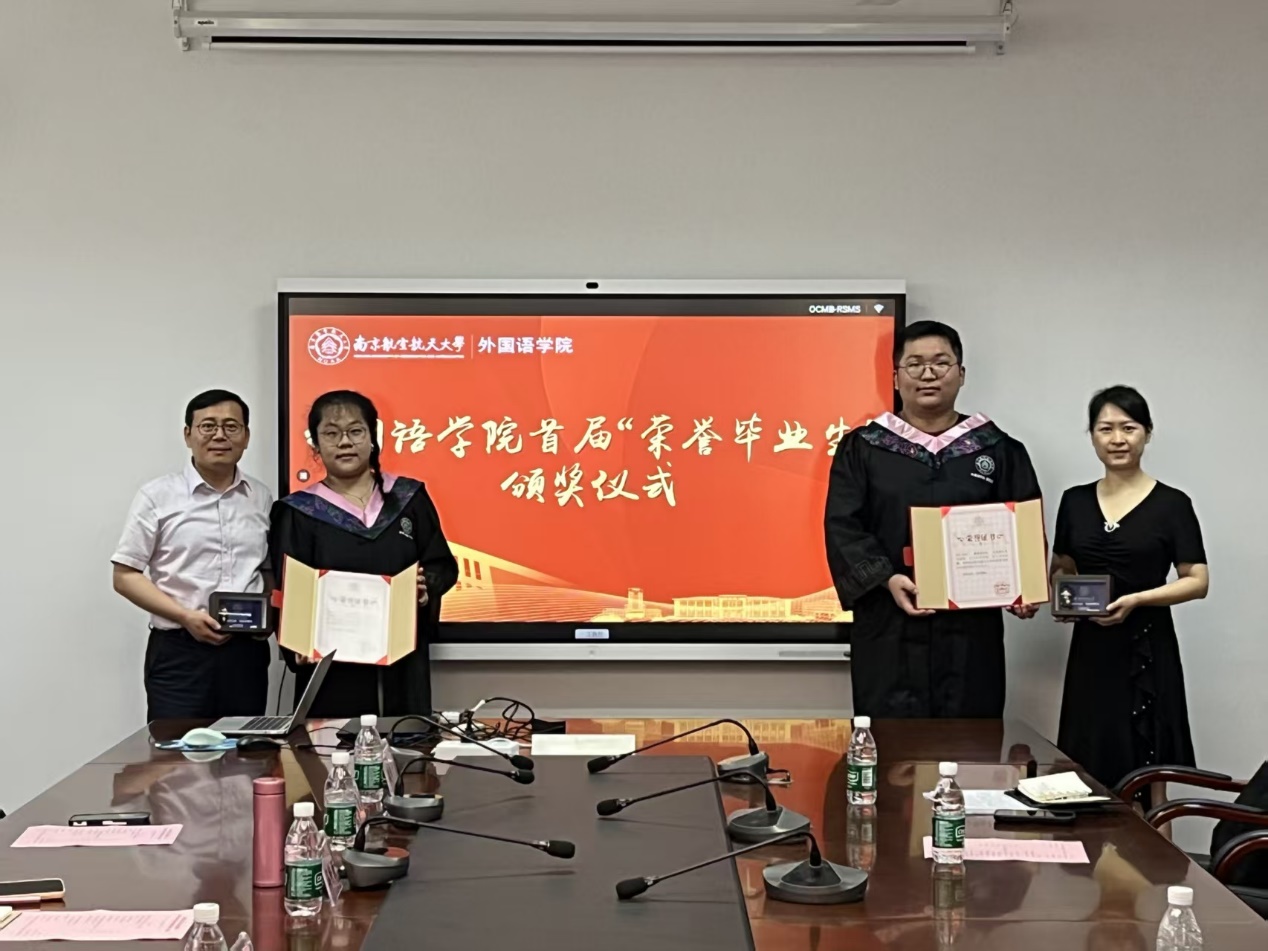 此外,今年,外国语学院首设“荣誉毕业生”称号,姜礼福和徐智鑫为首届获此称号的同学夏晨宸和杨鑫雨颁奖,勉励他们继续在未来发展中,牢固树立责任意识,发扬勇于担当、开放包容、互助共进的外院精神。