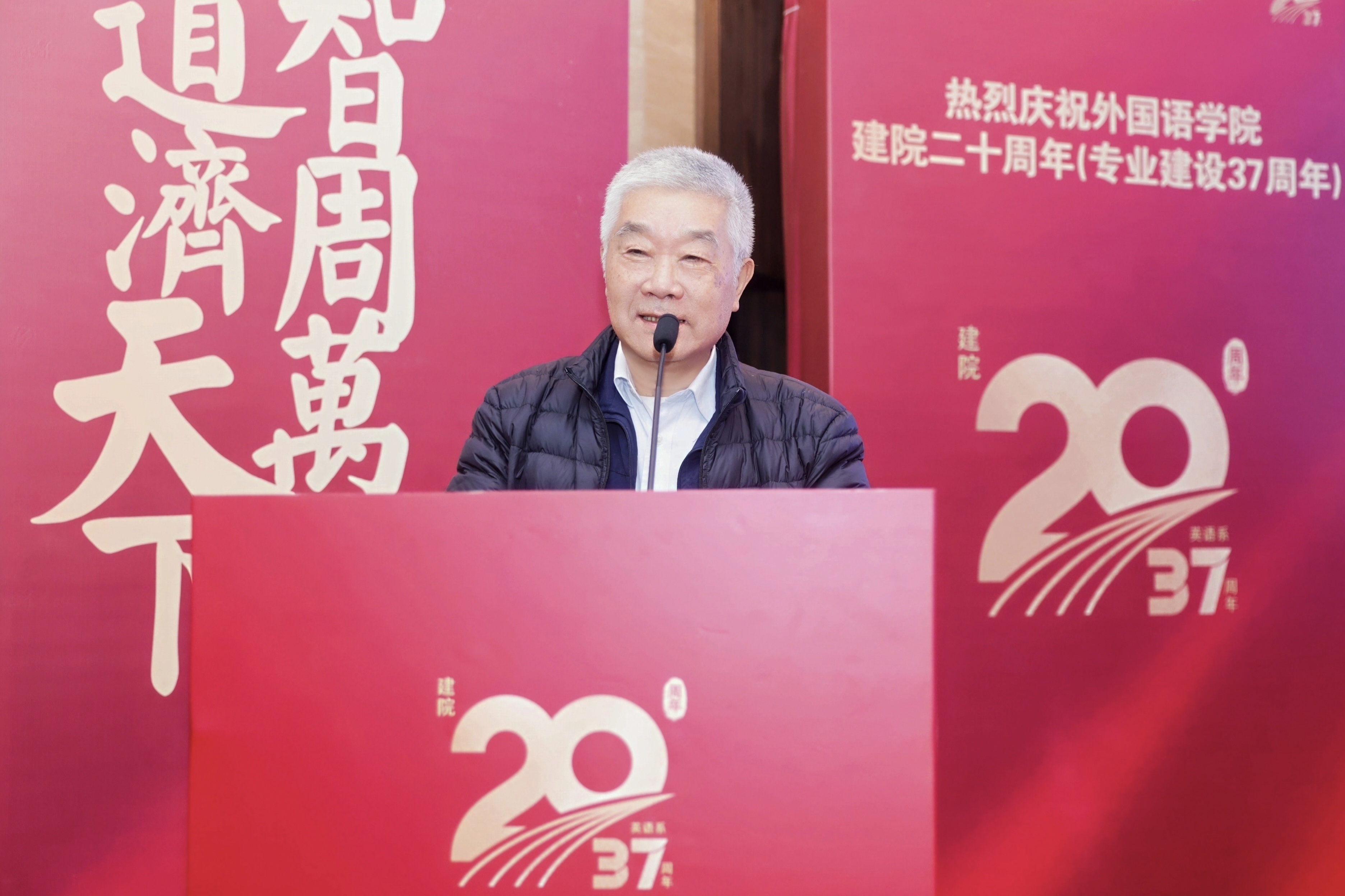 外国语学院老领导代表吴鼎民教授作为学院发展的贡献者和见证者,回顾了学院二十载筚路蓝缕、薪火相传的办学历程,向所有为学院发展倾注心血的师生、校友表达了深切敬意与感谢,并鼓励全院师生创造新的辉煌,为学校的发展与国家的战略需求贡献外语智慧与力量。