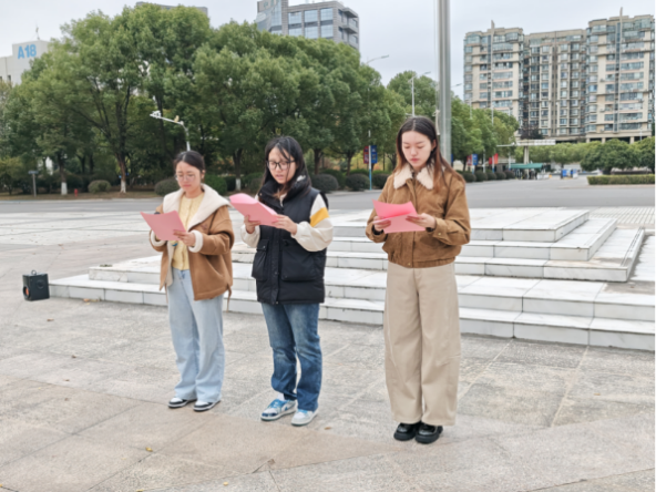 外国语学院本科生联合党支部党员代表许欣宜、吴漪苇与廖海雲共同带来诗朗诵《奋进新征程》。朗诵以饱满的情感,将二十届四中全会描绘的宏伟蓝图娓娓道来,抒发了青年一代听党话、跟党走,矢志不渝投身民族复兴伟业的壮志豪情。